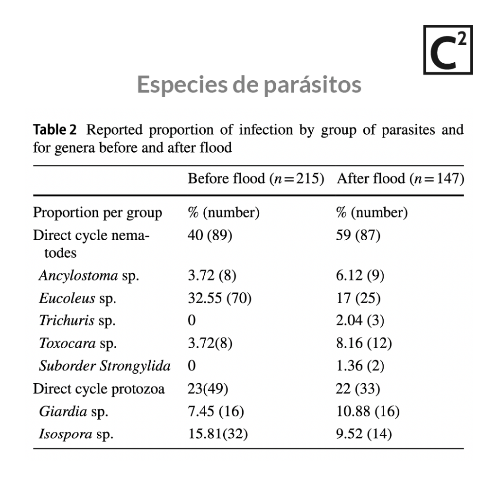 Con las muestras previas y posteriores a la inundación, pudieron analizar si existió alguna influencia de este evento climático sobre la ocurrencia de parásitos. Primero, determinaron los géneros de parásitos, separados en dos grupos: nemátodos, que son los parásitos de tipo gusanos redondos, como Ancylostoma, Eucoleus, Trichuris, Toxocara y Strongylida; y protozoos, unicelulares, como Giardia e Isospora.