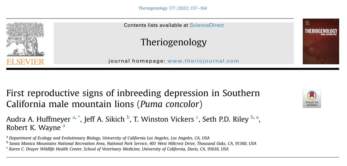 Artículo: Huffmeyer, AA et al (2022). First reproductive signs of inbreeding depression in Southern California male Mountain Lions (Puma concolor). Theriogenology, 177, 157–164. doi.org/10.1016/j.theriogenology.2021.10.016