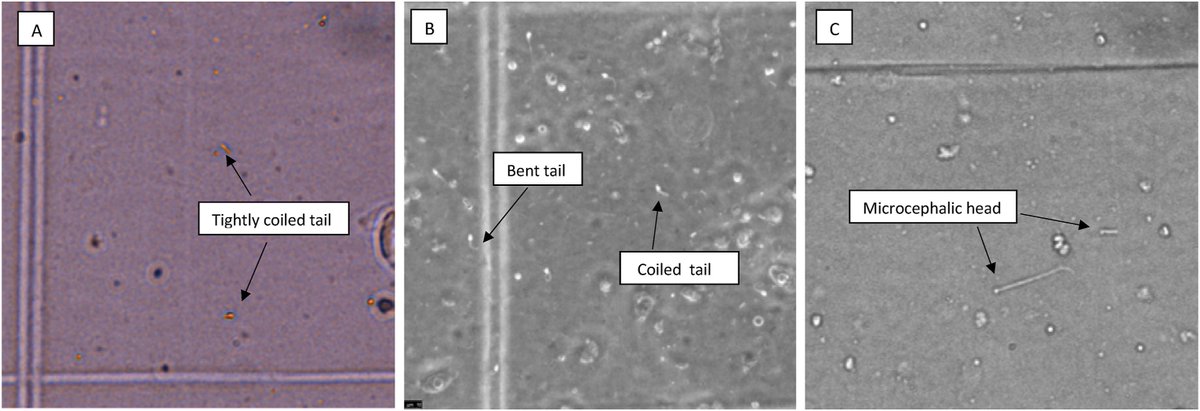 La teratospermia es la presencia de defectos en los espermatozoides que afectan la fertilidad de los machos. Para evaluarla, extrajeron post-mortem testículos de 5 machos. Encontraron defectos como cola dobladas o enroscadas, y microcefalia (cabezas pequeñas).